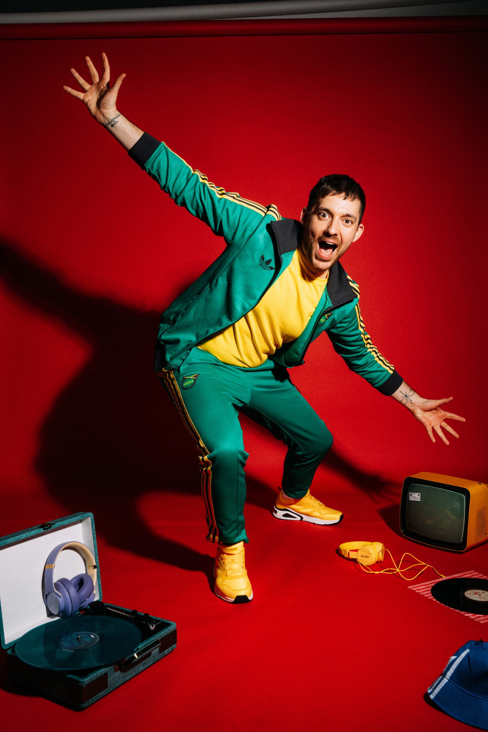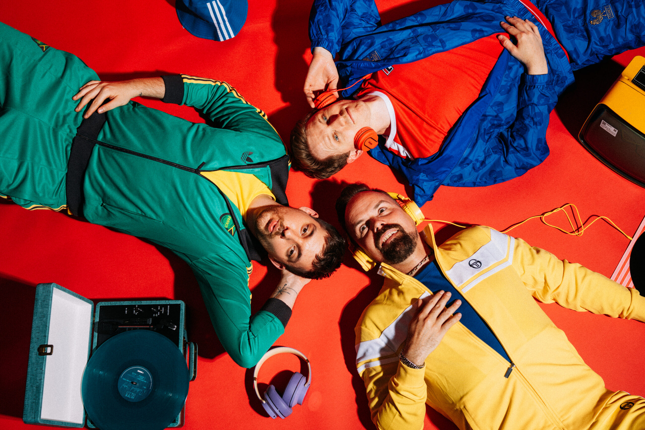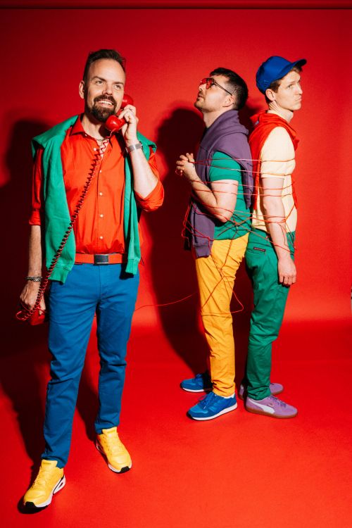 Die Bandmitglieder von Zanadu liegrn auf dem Boden mit bunten Klamotten