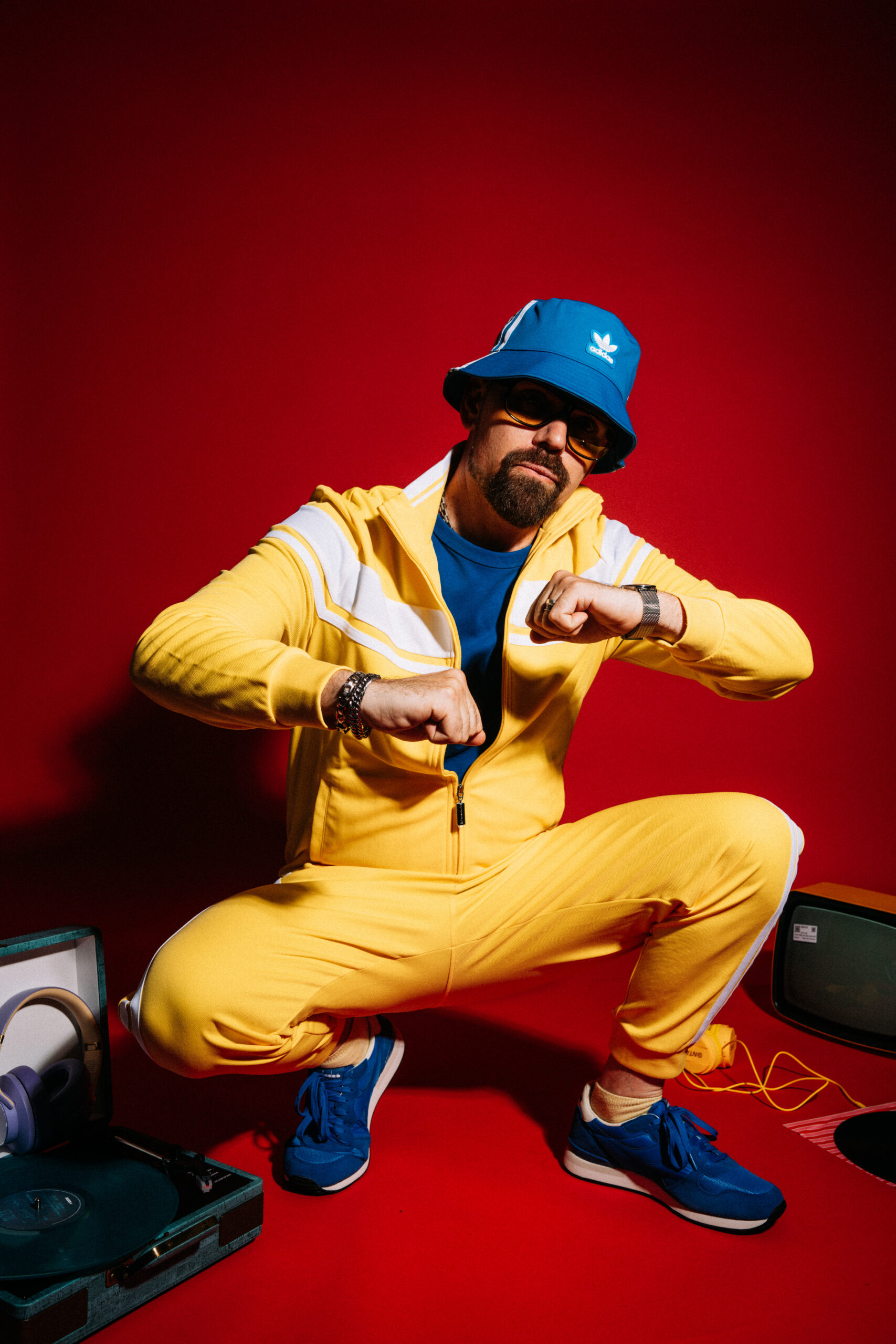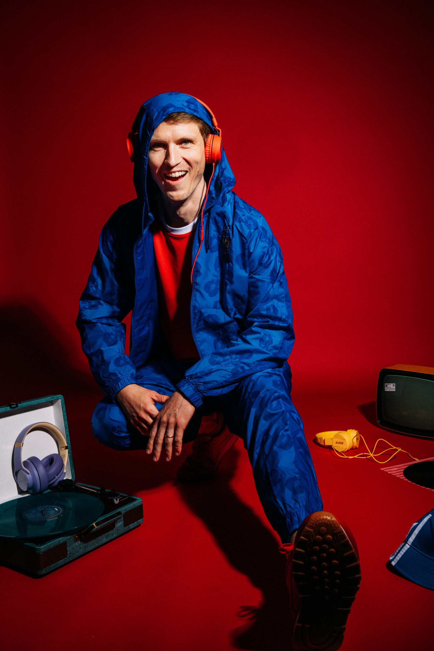 Bandmember zwischen Kopfhörern und Musik Gegenständen